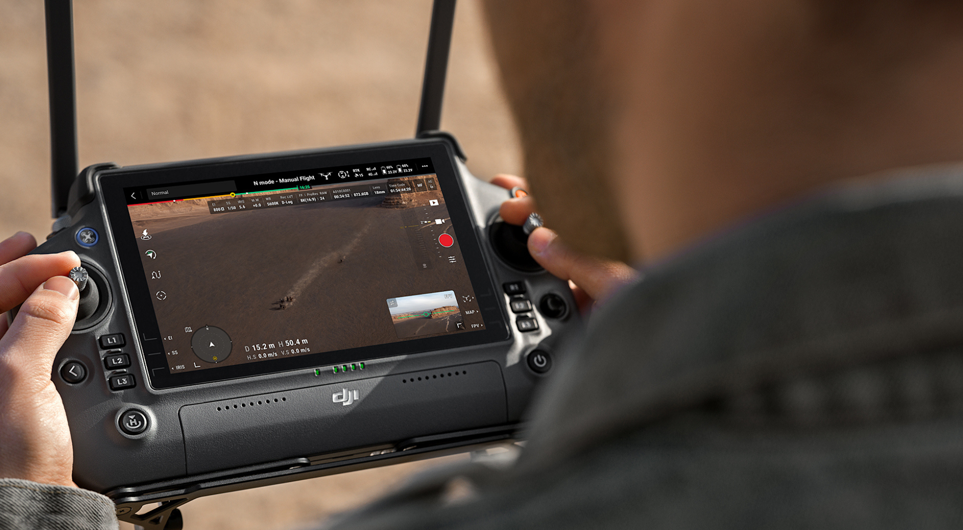 The controller features the DJI Pilot 2 app with a revamped interface designed especially for content creators, with streamlined capabilities for checking details such as camera exposure, video specs, focal length and gimbal angle.
