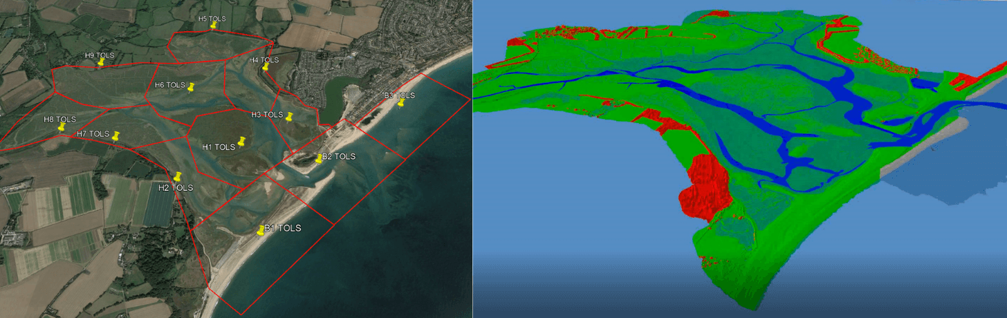 The left view shows the end of the spit from an aerial perspective colourised with realistic RGB colour, while the right shows a cross-section of the same model coloured by elevation.