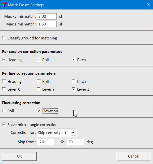 Per Line Correction: The default setting is to solve Lever Z (elevation) per line. Many data sets will improve with this correction. You may consider solving other parameters per line, with roll being the most likely.