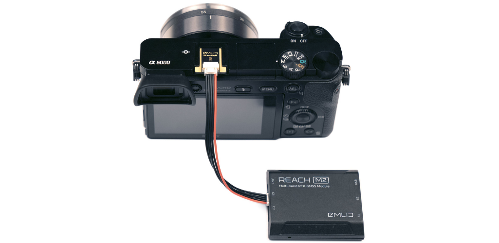 Reach connects directly to the camera hot shoe port, which is synced with the shutter. This solves the problem of positioning, as the time and coordinates of each photo are logged with a resolution of less than a microsecond.