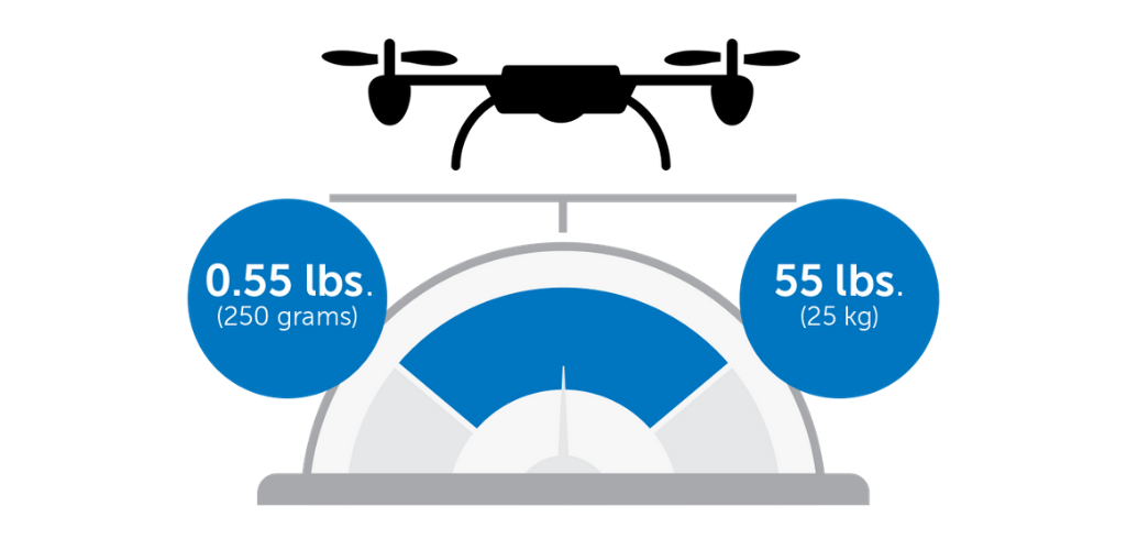 In the U.S, you must register your drone if it weighs between 0.55 lbs (250 grams) and 55 lbs (25 kg).