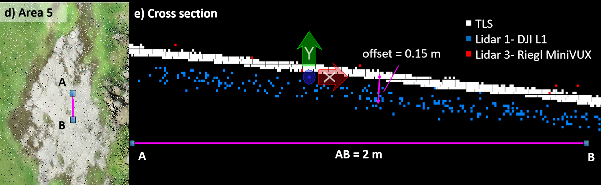 For instance, the graphic below (figure 3) shows how, at a cross-section over Area 5, the L1 point cloud was found to be 0.15m below the TLS and the Riegl MiniVUX point clouds.