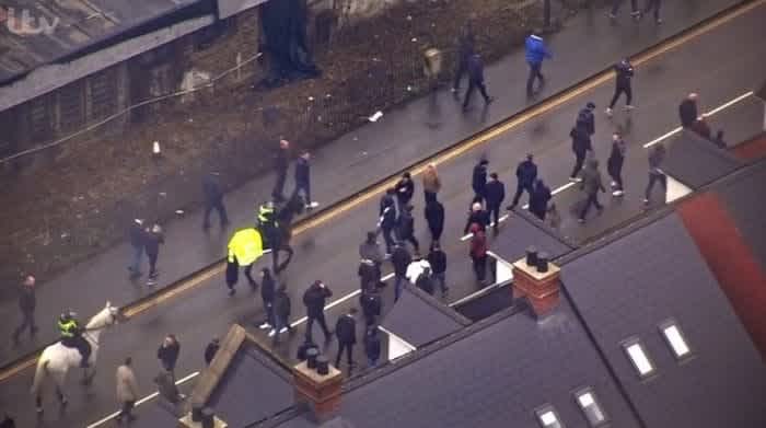 It begins to kick-off between Norwich and Ipswich fans. Picture, ITV.