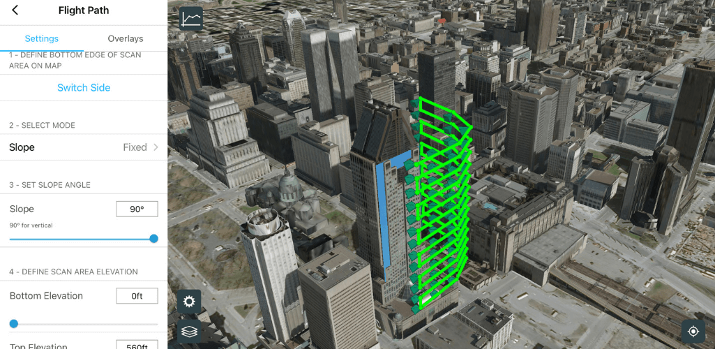 Terrain Follow: Leverage the Esri 3D World Terrain database to capture even higher quality data. Terrain Follow creates 3D flight paths that follow the ground at a constant height, ensuring proper overlap in the data capture.