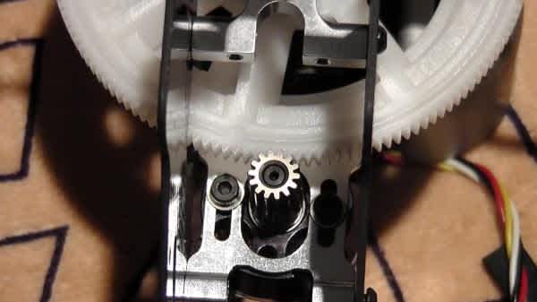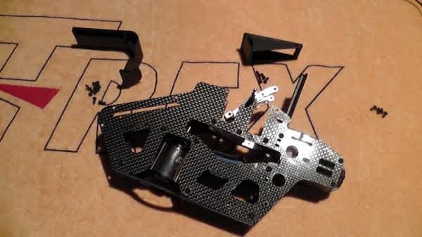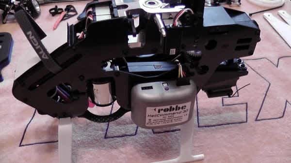 Next we construct the frame. Again, removing all the pre installed bolts, and re-building the frame. The next part is very tricky if unaware of the mechanics and order of the build. The servos are arranged in such a way that if you are leaving the frame built as it comes from the factory. It is necessary to remove some bolts from the CNC servo supports, pivot them, and slide into place the rear elevator cyclic servo. As Align have incorporated the servo mounts into the bearing blocks. Otherwise it’s impossible to get into place. Another point is we should install the motor before the servos, as it is almost impossible to access the motor bolts with the cyclic servos in place. We need to ensure the motor is in the rite position before securing. So at this stage we slide in the main shaft and attach the main gear. So we can line up the motor pinion with the main gear. Leaving a small gap between the teeth, so they don’t wear with the constant friction of close contact. Despite the tricky nature of this section, Align have done a good job in the design and construction of this section of the helicopter. Removing the front plastic battery holder also makes this part easier. The build is as expected much more involved than described, but described here are just some of the points that require a little extra care.