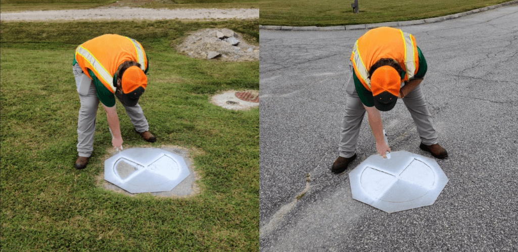 "Our preferred way is an old stop sign that we repurposed to use as a stencil to fit exactly over the top of manholes.