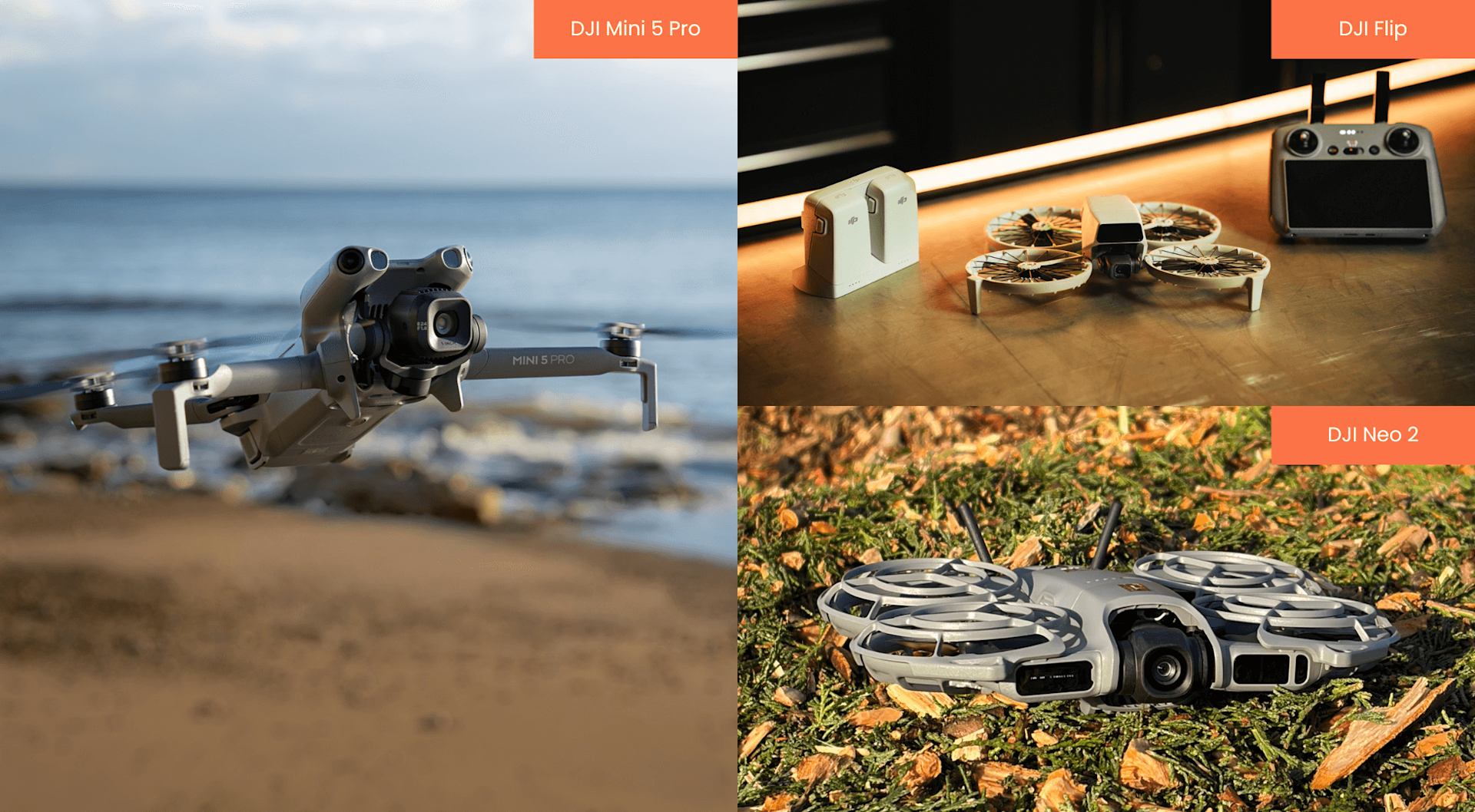 Comparison between DJI's most recent sub-250g drones: DJI Mini 5 Pro, DJI Flip, and DJI Neo 2;