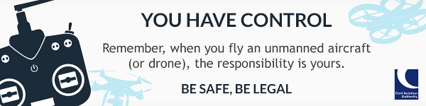 If you intend to use an unmanned aircraft for any kind of commercial activity, you must get a ‘Permission’ from the Civil Aviation Authority, or you could face prosecution. For more details, visit www.caa.co.uk/uas