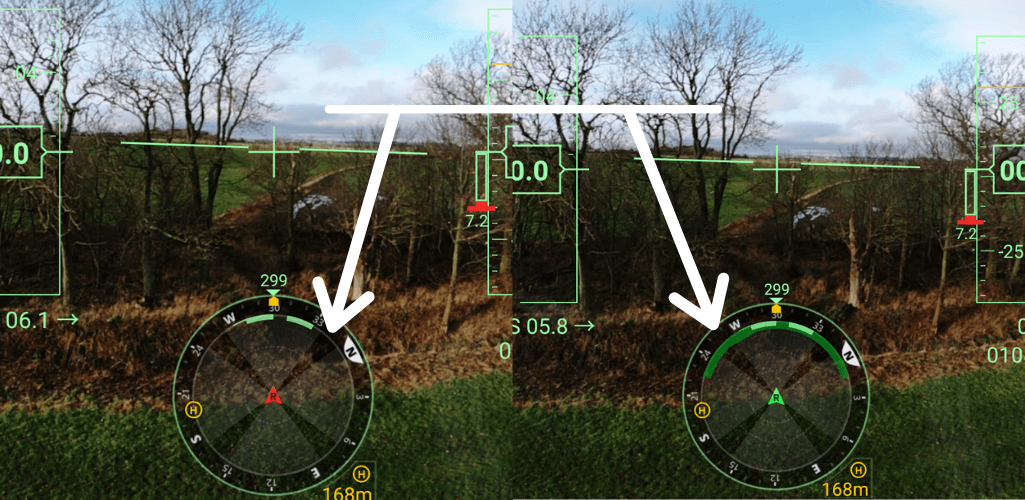 When obstacles are detected by the radar, the compass navigation display at the bottom of the Primary Flight Display (on the controller screen) will show numerous colours.