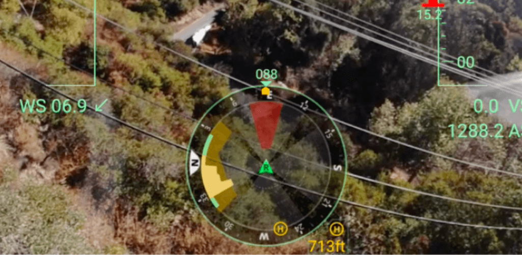 The navigation display shows pockets of yellow and green, but the aircraft is able to approach the cables as they are not being picked up by the drone.