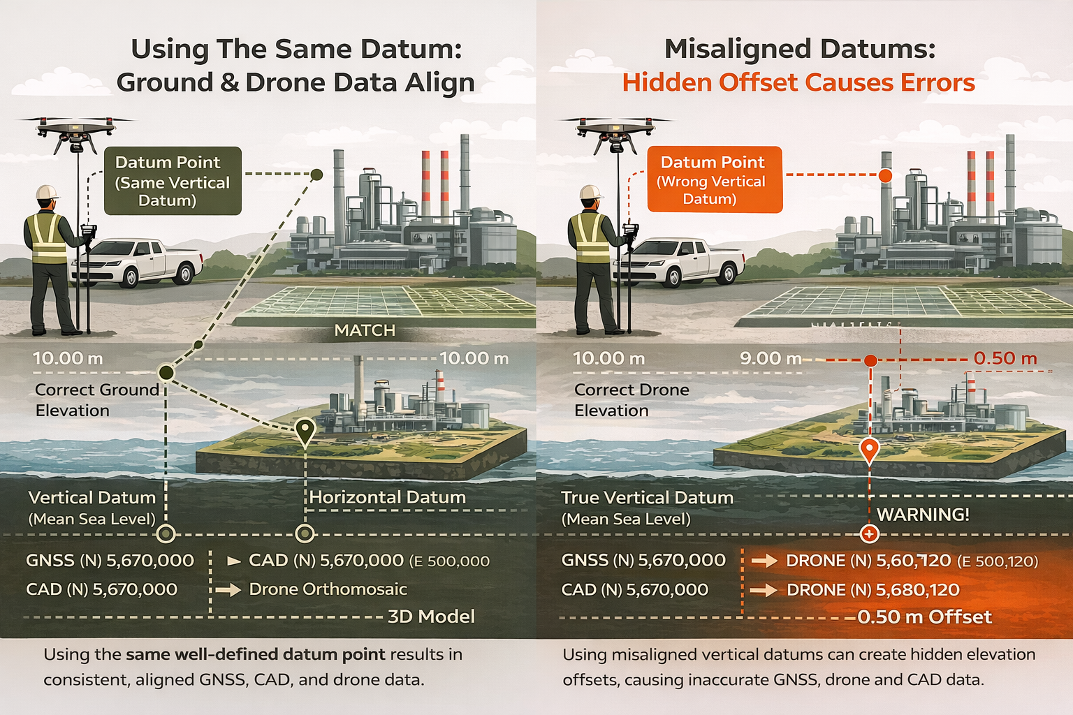Shows why datum mismatches are a common cause of survey and drone mapping errors;