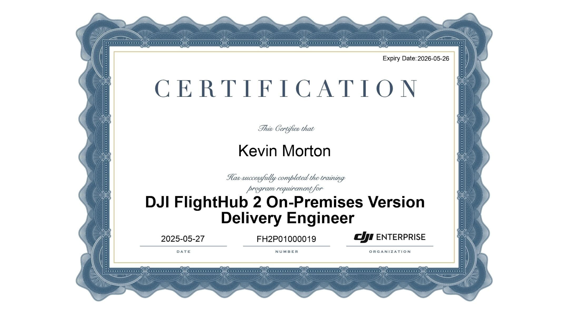 As a DJI-certified Dock partner, heliguy™ can help you set up FlightHub 2 On-prem. Our Assistant Operations Manager, Kevin Morton, is a DJI-certified FlightHub 2 On-Premises Delivery Engineer, having successfuly completed his training with the DJI Delivery Engineer team.