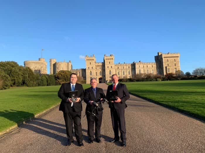 Andrew McQuillan, left, with Ritchie Southerton, right. Holding the Inspire 2 is Paul, from Crowded Space Drones, who was used as a spotter for the job. They are standing in front of Windsor Castle.