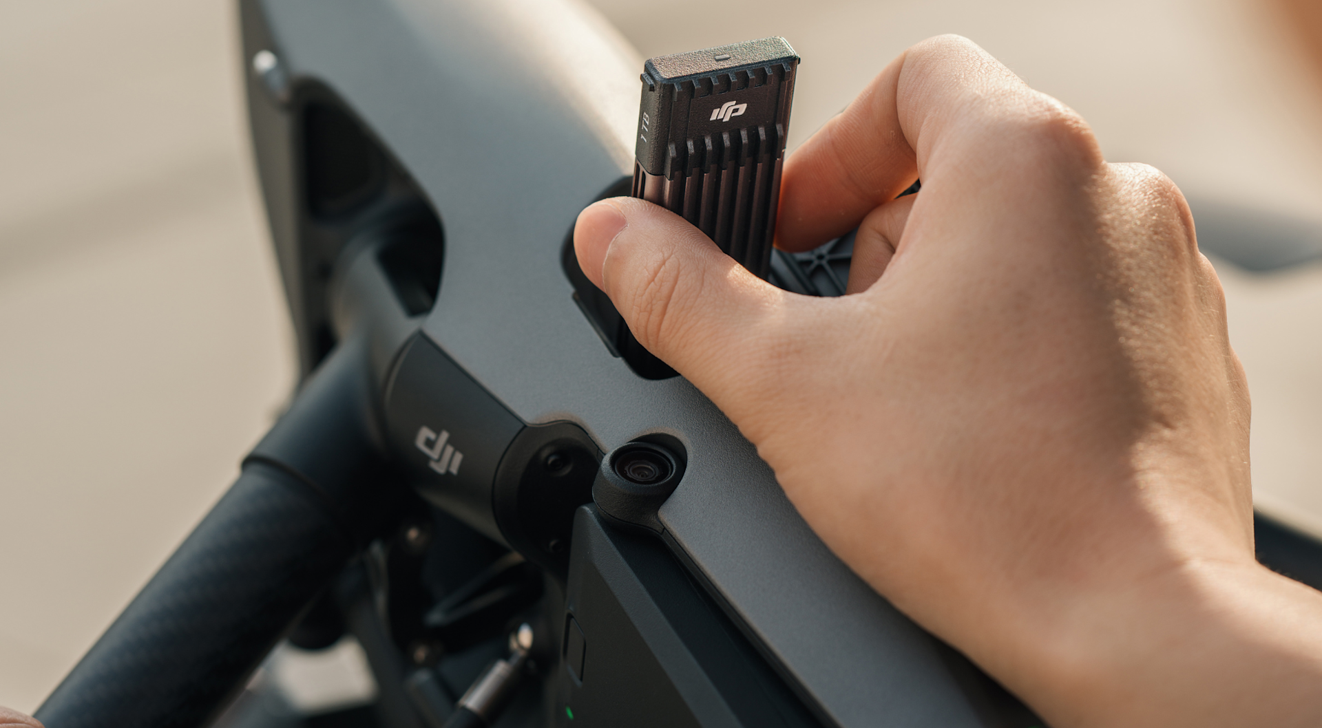 The DJI Inspire 3 comes with the DJI PROSSD 1TB memory card, which can be removed and supports a maximum read speed of 900Mbps (measured using the included USB-C to USB-C data cable on Apple MacBook Pro 2021) and the footage can be read on a computer directly through the provided USB-C to USB-C cable without the need for a card reader.