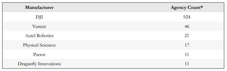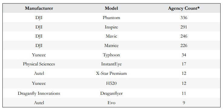 Popular Drones Among Public Safety Agencies by Drone Manufacturer. *Reflects the number of agencies with at least one drone of this make or model, not the total number of drones in service with public safety agencies. Some agencies have multiple types of drones from more than one manufacturer.