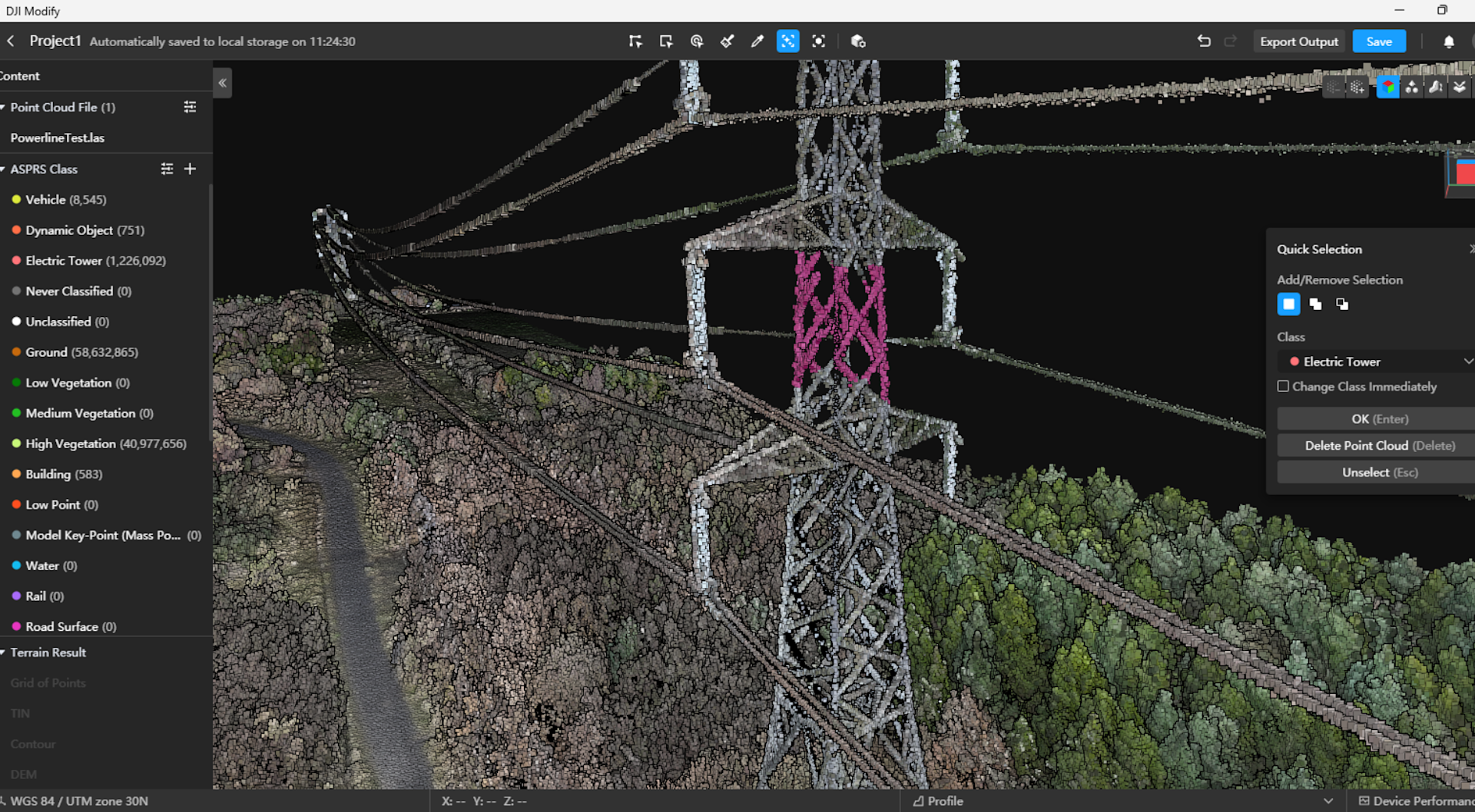 Point cloud quick selection which can automatically identify point cloud structures and then correct misclassified point clouds. This tool is perfect for point clouds that have already been automatically classified, and enables users to quickly select specific classes (eg, powerlines, poles, trees) with a single click.