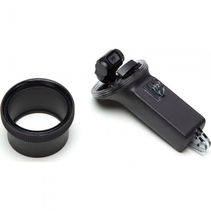 The waterproof case includes two mounting brackets that allow users to attach the case to other equipment. Two buttons on the outside grant precise control of the Osmo Pocket.