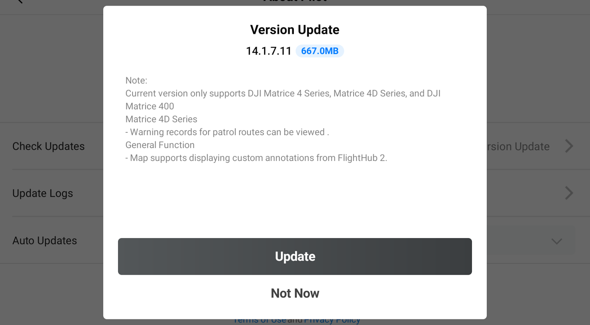 DJI Pilot 2 App version 14.1.7 is now available. This update improves app stability when operating with DJI Matrice 4 and 400 Series drones.