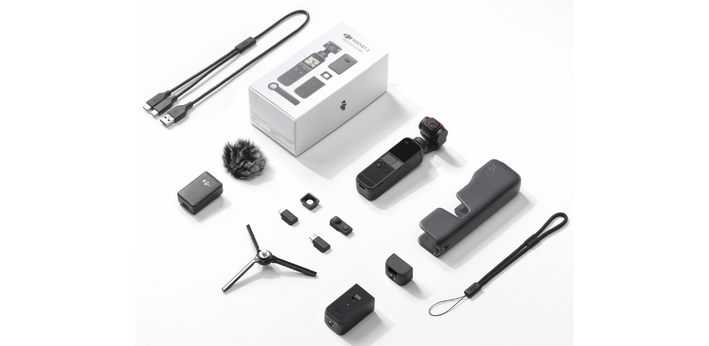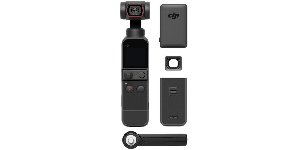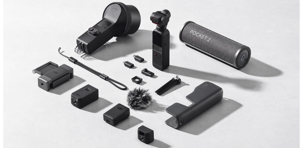 The DJI Pocket 2 Creator Combo includes the Mini Control Stick, Tripod Mount (1/4”), Wide-Angle Lens, Wireless Microphone + Windscreen, Do-It-All Handle, and Micro Tripod. It is available for £469/$499.