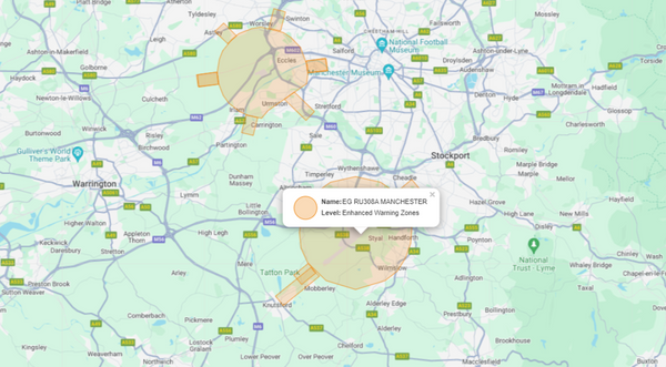 The area surrounding Manchester Airport shows the Flight Restriction Zone around the airport, and is flagged as an Enhanced Warning Zone…