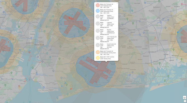 …whereas the area covering John F Kennedy International Airport has Restricted Zones, Altitude Zones, Authorization Zones, and Warning Zones.
