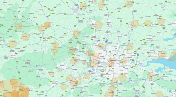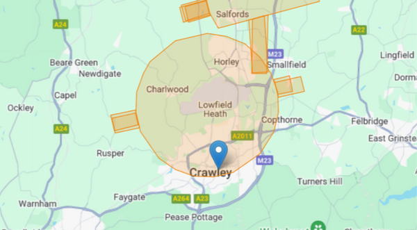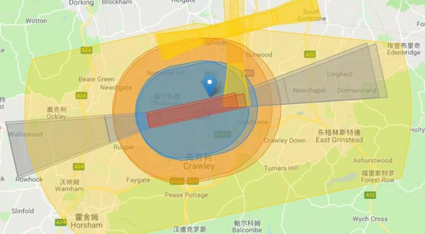 The image below shows how previously, before the update, the area around Gatwick Airport had multiple DJI geofencing zones in place - such as Restricted Zones; Altitude Zones; Warning Zones, Authorisation Zones, and Enhanced Warning Zones.