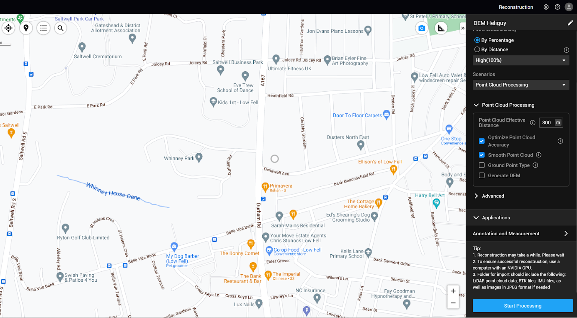 2: Once imported, tick the 'Generate DEM' option under Point Cloud Processing. At this stage, Terra will conduct automatic ground classification, eliminating surface structures such as trees and buildings.