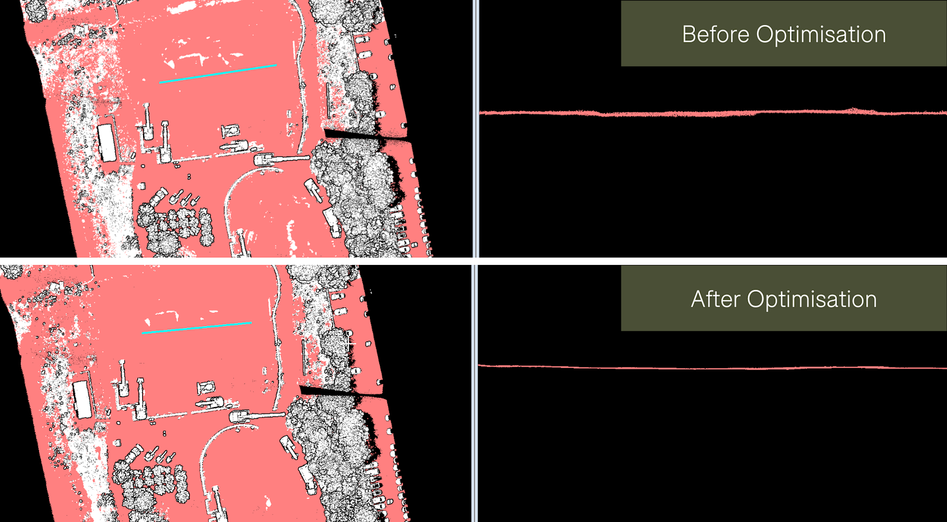 And, this graphic below illustrates the difference before and after optimisation: The cross-section of an area of ground (depicted by the turquoise line on the images on the left) is thinner and tighter following optimisation.
