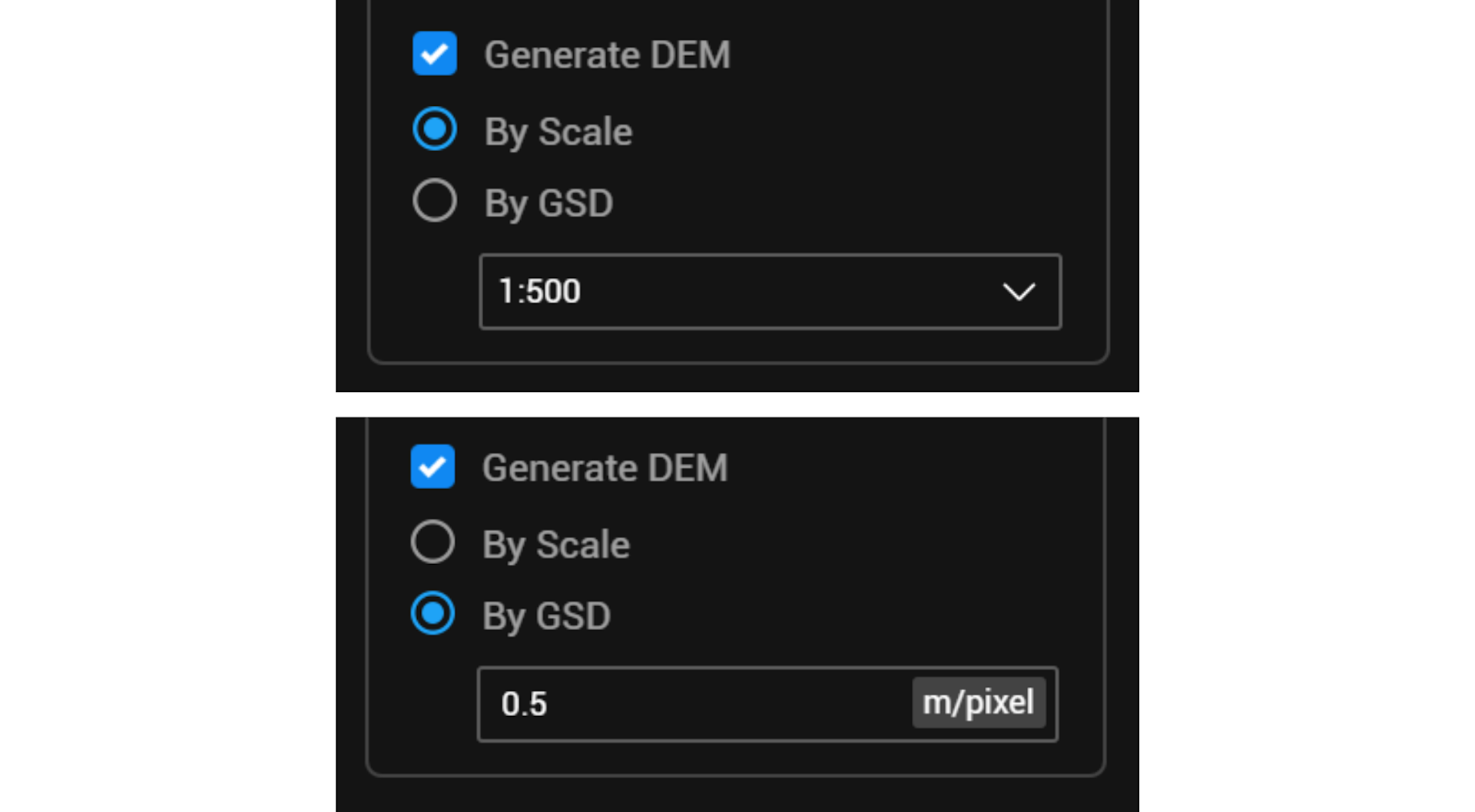 Generate By GSD: Results resolutions based on Ground Sampling Distance (GSD).