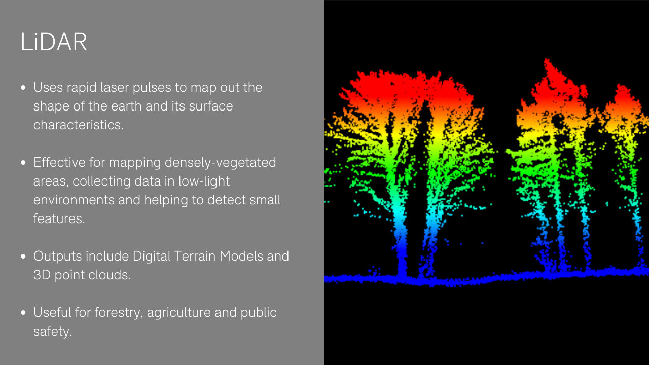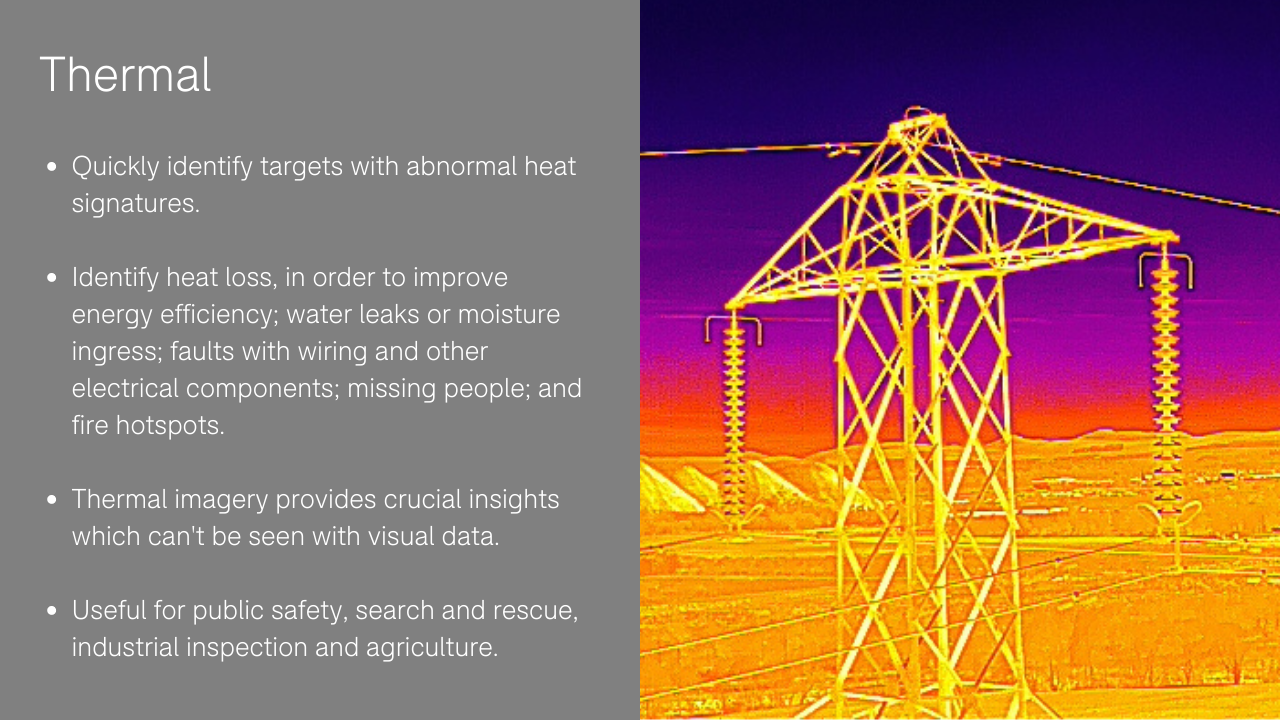 Drones can carry different sensors to enable operators to collect a range of data - such as visual, LiDAR, photogrammetry and thermal - depending on the job at hand. Types of drone data includes:
