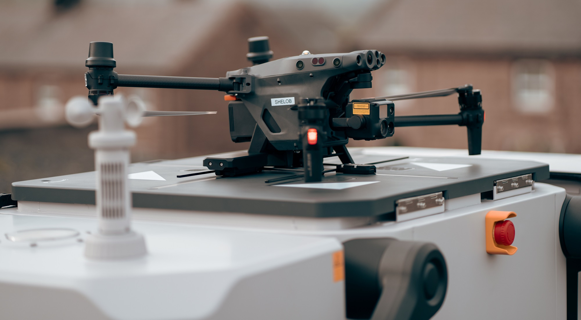It is housed in a protective box which provides shelter for the drone when it is not operational and can also serve as a launching/landing pad and a charging hub.