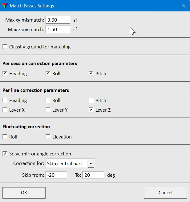 Per Session Correction: The default setting is to solve heading, roll, and pitch per session. This is the most systematic correction and most data sets will improve with this correction.