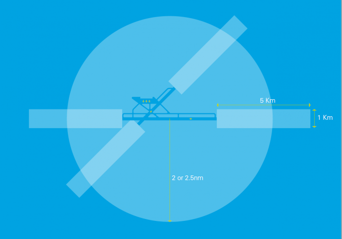 Runway Protection Zones: A rectangle extending 5Km from the threshold of the runway away from the aerodrome, along the extended runway centreline, and 500m either side- also to a height of 2000 ft above ground level.