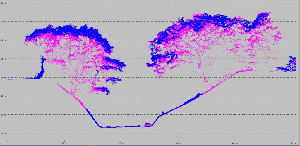 In this example, the LiDAR data is pink and the photogrammetry is blue. Notice how the photogrammetry does a great job in capturing the tops of trees, but cannot compete with the LiDAR when it comes to obtaining terrain information in the areas obscured by the vegetation.