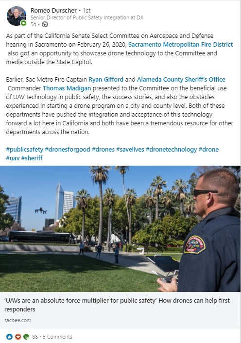 Following the Senate meeting, Romeo Durscher, DJI's Senior Director of Public Safety Integration, took to LinkedIn to praise Captain Gifford and Commander Madigan.