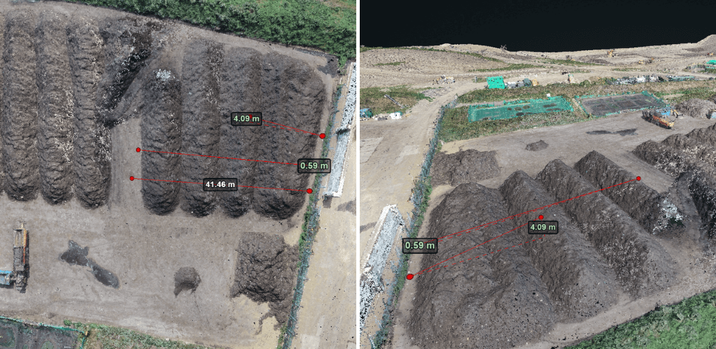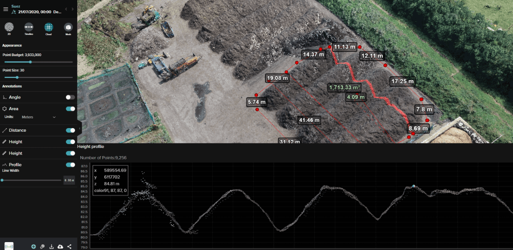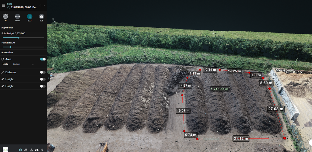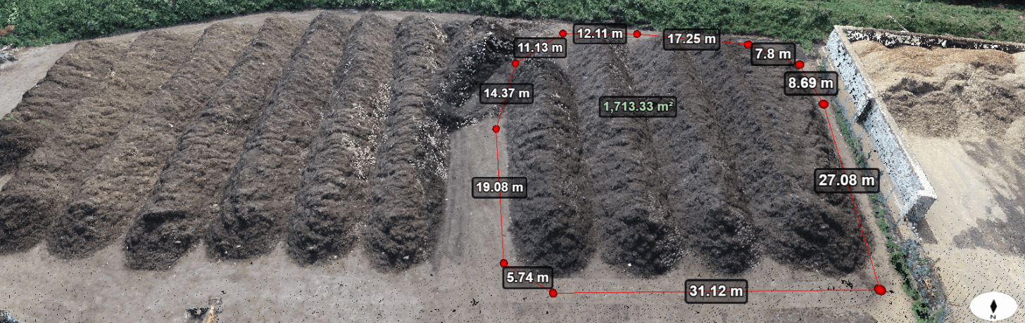 The second image shows how the software can be used to calculate the area of the stockpile: In this case, 1,713.33 m².