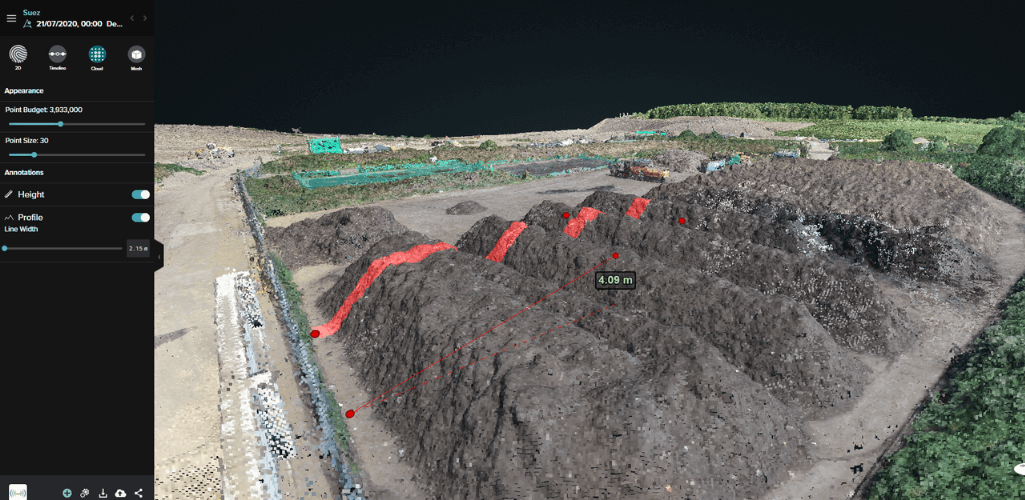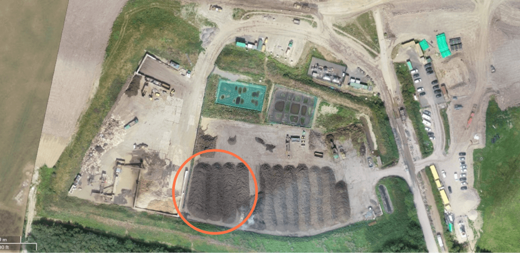 In this case, SUEZ used the drone data and Esri Site Scan to create an orthomosaic of the whole site, including stockpiles. The stockpile which will be measured in step three (below) is highlighted by the orange circle.