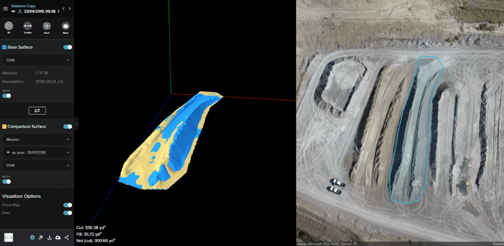 Continuing using Esri Site Scan as an example, one of the biggest advantages is being able to conduct comparisons, analysing how a stockpile has changed over time and working out how much material has been added and removed.