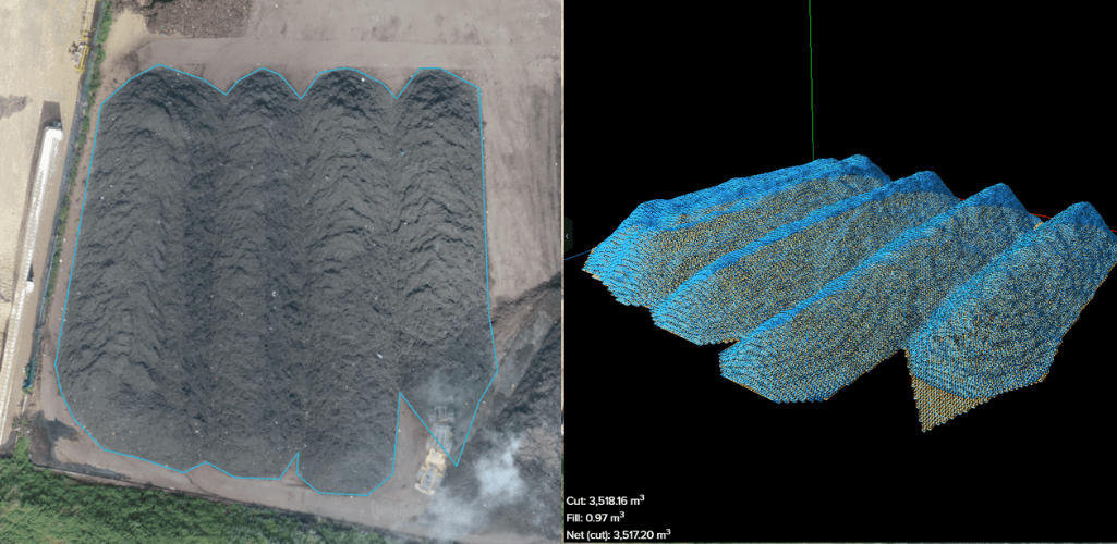 You can then convert the orthomosaic into a 3D mesh (right-hand graphic) to better visualise the stockpile.