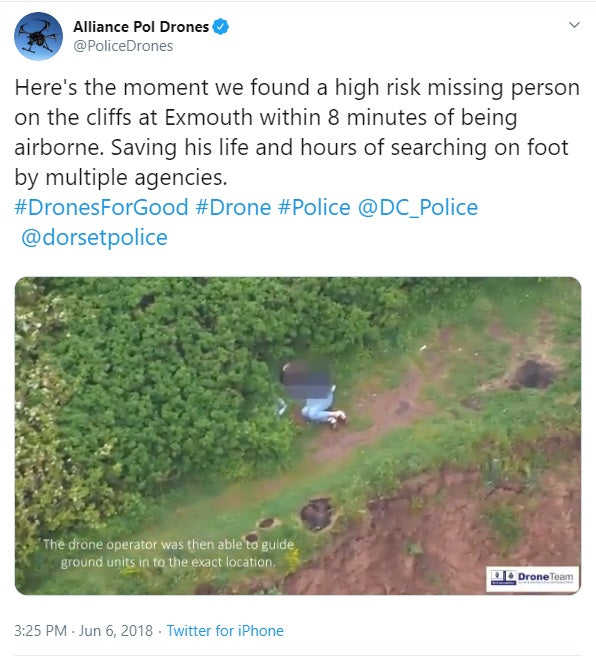 The man was found within eight minutes of the drone being airborne and the drone operator was able to guide ground units to his exact location.