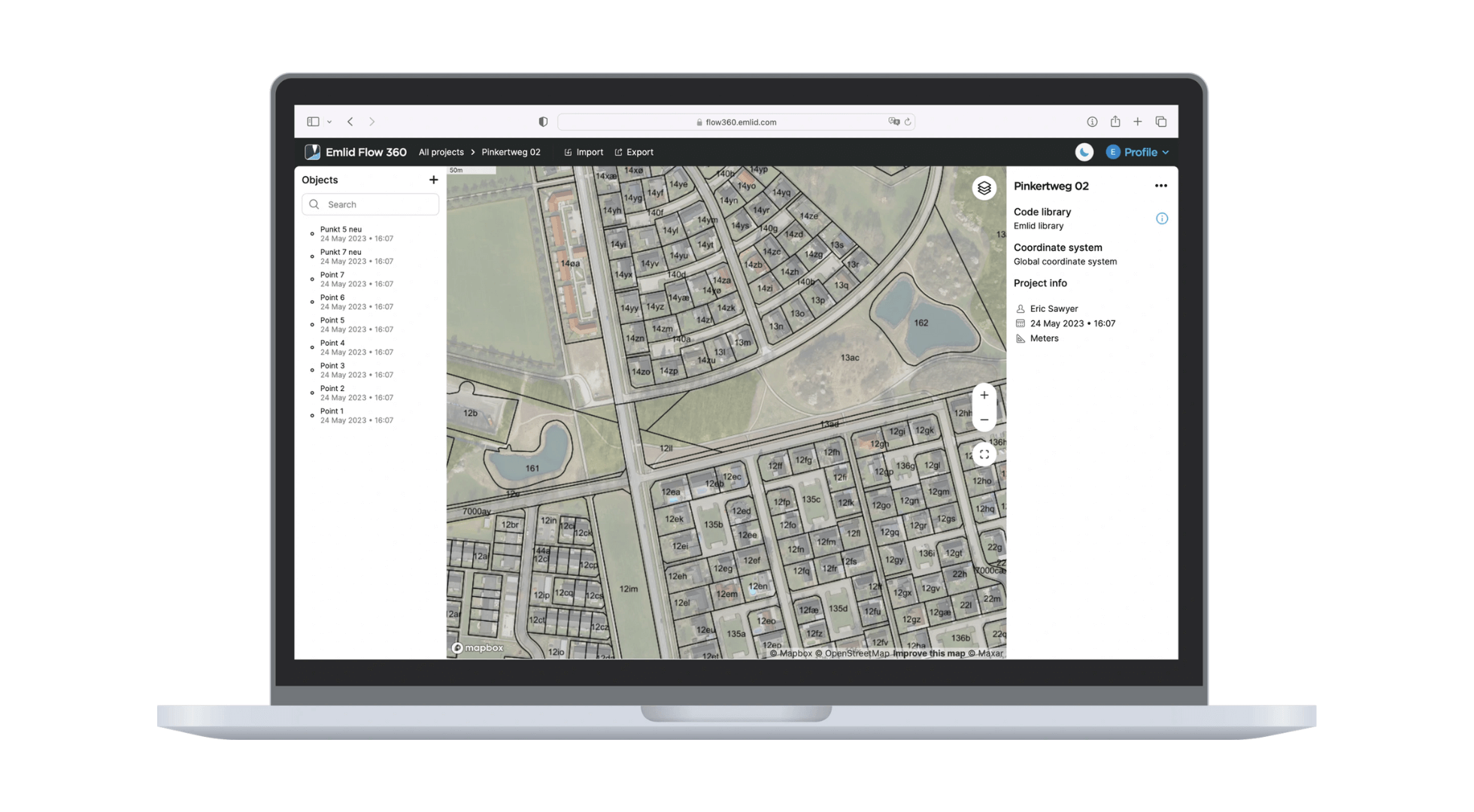 Emlid Flow 360 (Web): Manage projects, coordinate systems and data sharing from any browser. Instantly sync field data to the office.