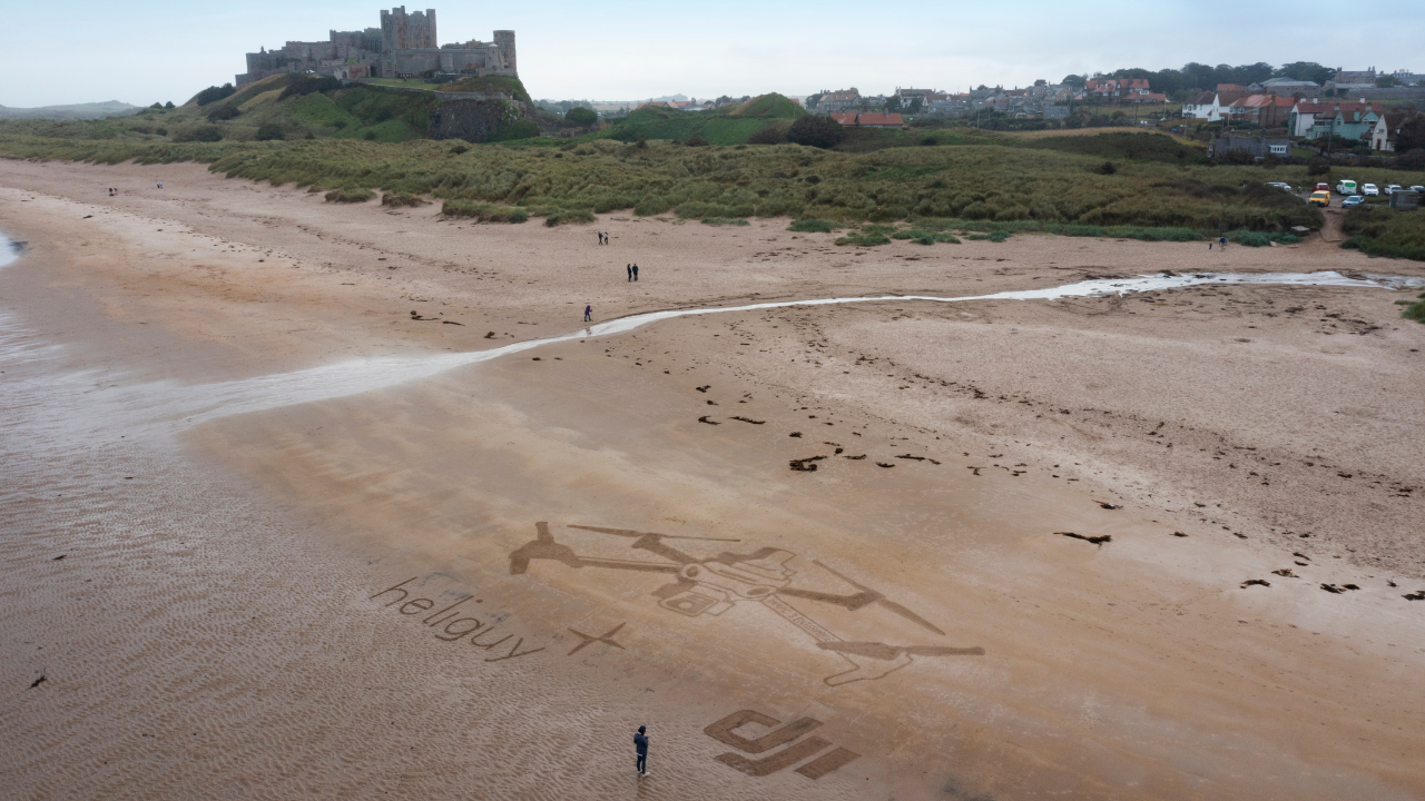 To help mark the launch of DJI’s latest surveying drone, heliguy™ teamed up with talented north-east-based sand artist Claire Eason to create the stunning 45 x 70-foot picture on Bamburgh beach, in Northumberland.