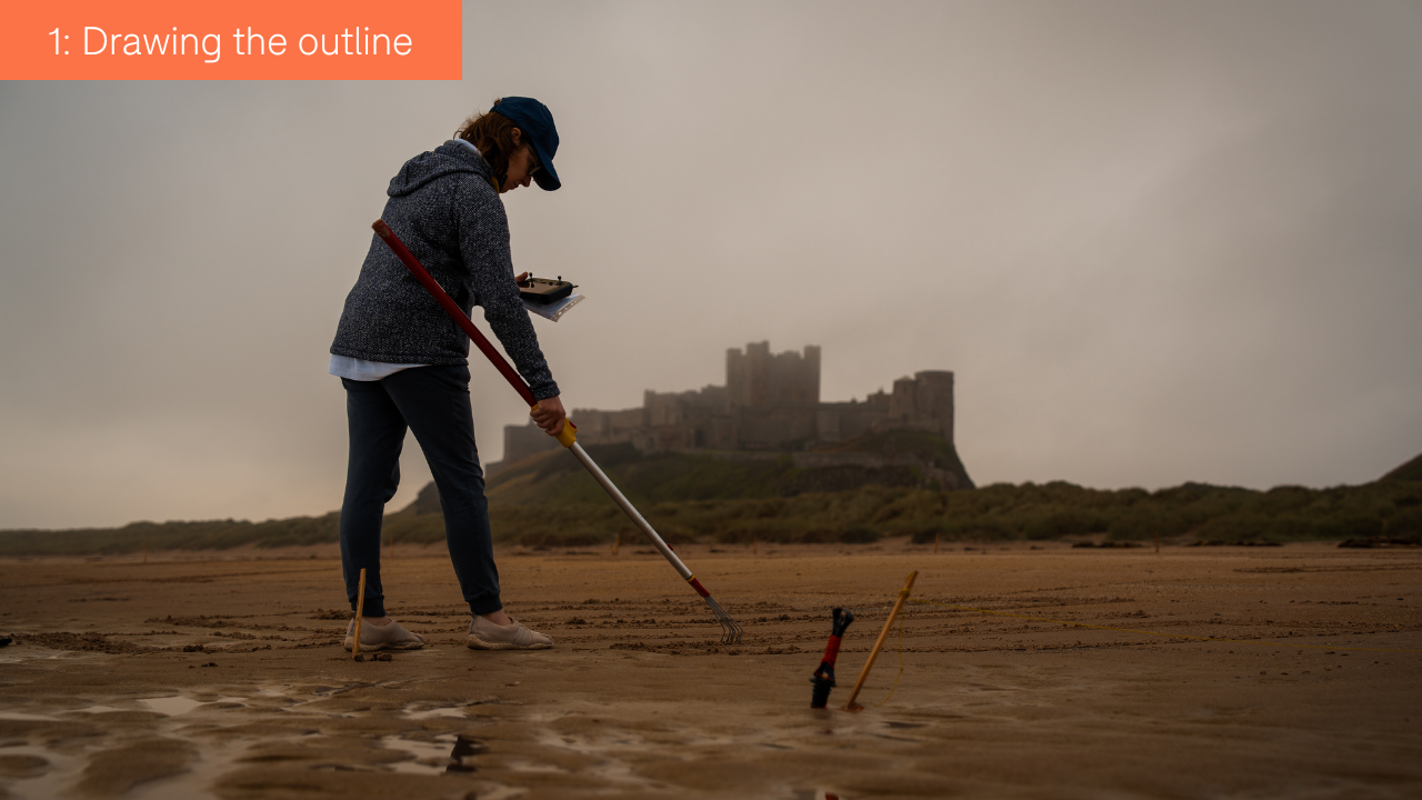 "A grid was placed over the paper image and this was scaled up on the beach using builder’s string and sticks. The outline on paper was then drawn on the corresponding sand squares using a rake...