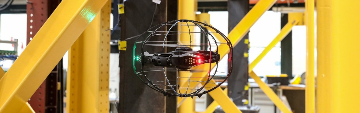 Protected by a lightweight cage, the drone allows customers to confidently inspect hazardous and difficult-to-access areas, typically in the infrastructure, energy, and oil and gas industries.