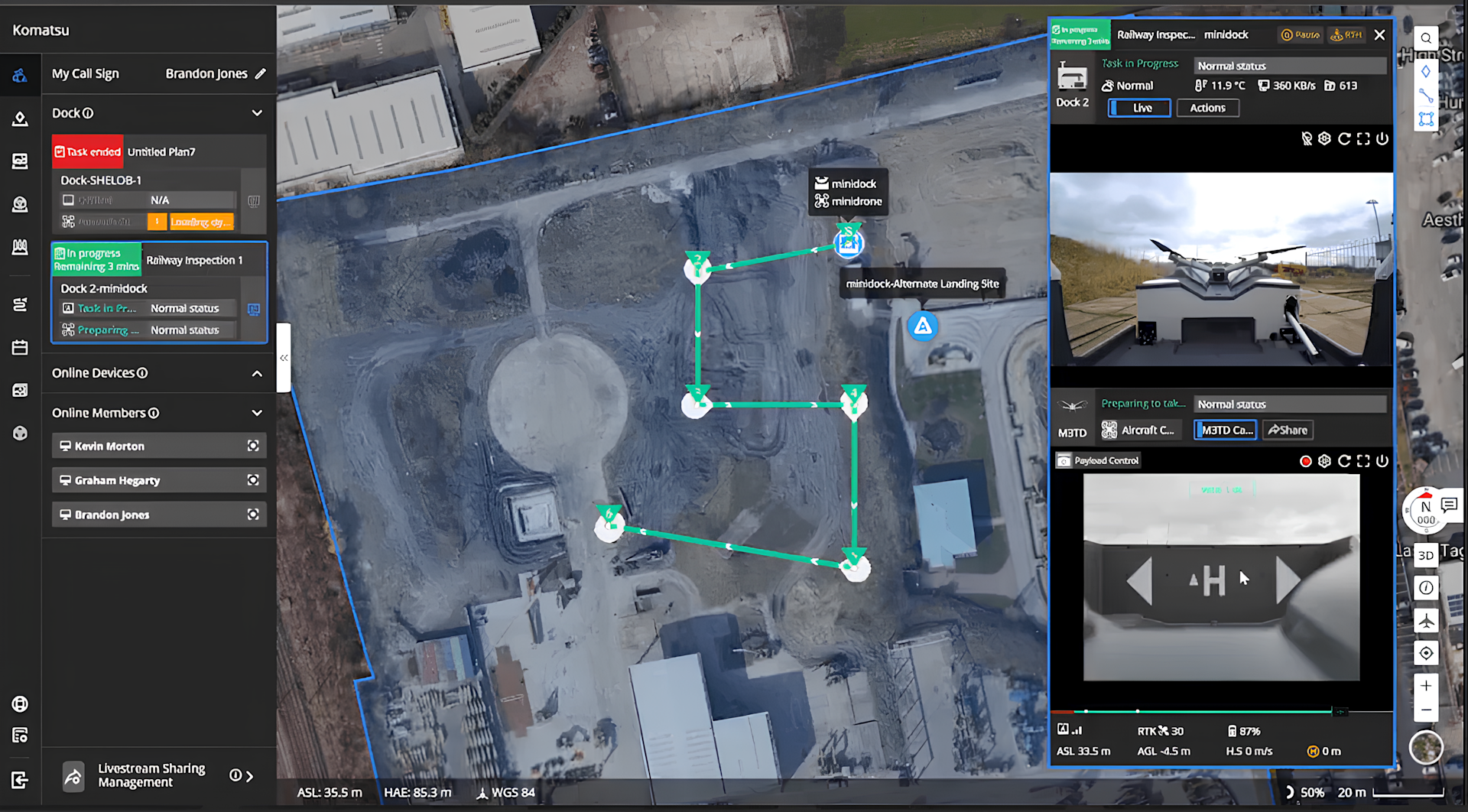 You can see the flight path, as well as the camera feed from the Dock 2 (top window, right) powered by an internal fisheye camera, and the camera feed from the drone (bottom window, right).