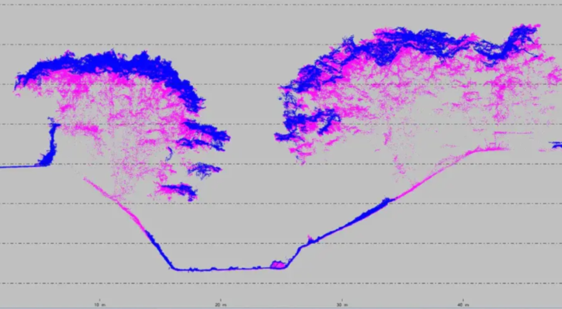 The picture shows that the LiDAR (pink) captures a more robust picture of the ground surface under the vegetation canopy compared to photogrammetry (blue). As such, LiDAR data can be used to generate precise digital terrain models (DTMs) and digital surface models (DSMs), allowing for detailed terrain analysis and volume calculations. This is useful for: