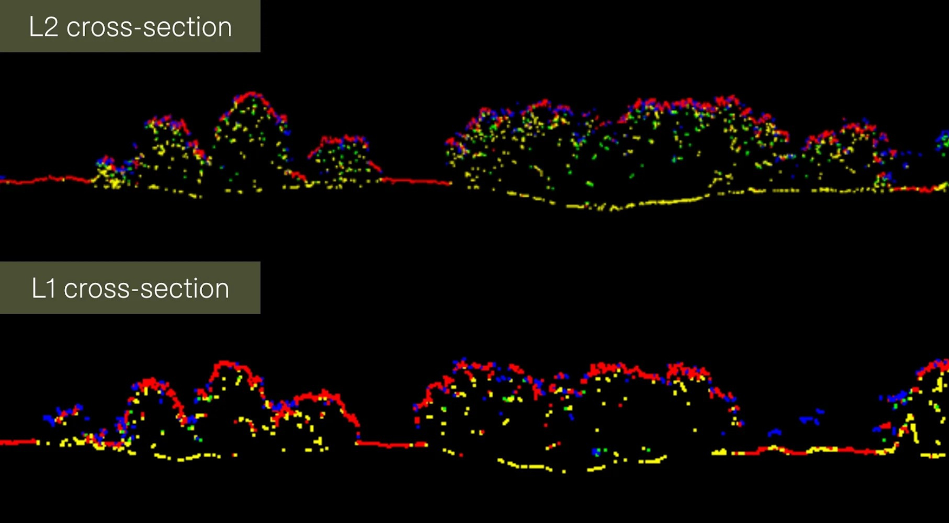 The graphic below demonstrates how the L2's key upgrades enable it to create a more robust and complete ground surface in vegetated areas, compared to its predecessor, the DJI Zenmuse L1.