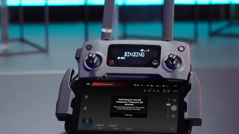On the Mavic press and hold the linking button on the underside of the drone under a rubber tab.