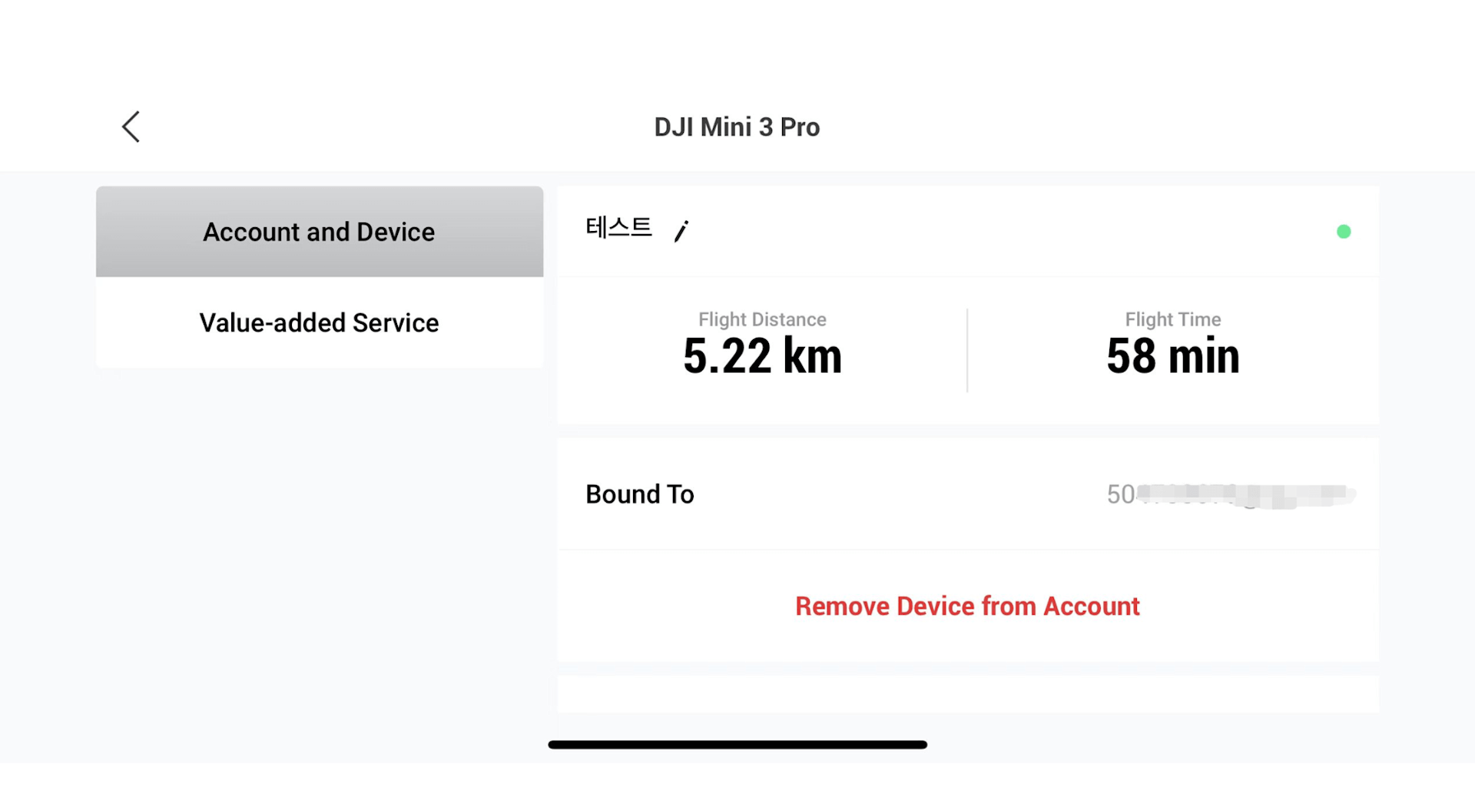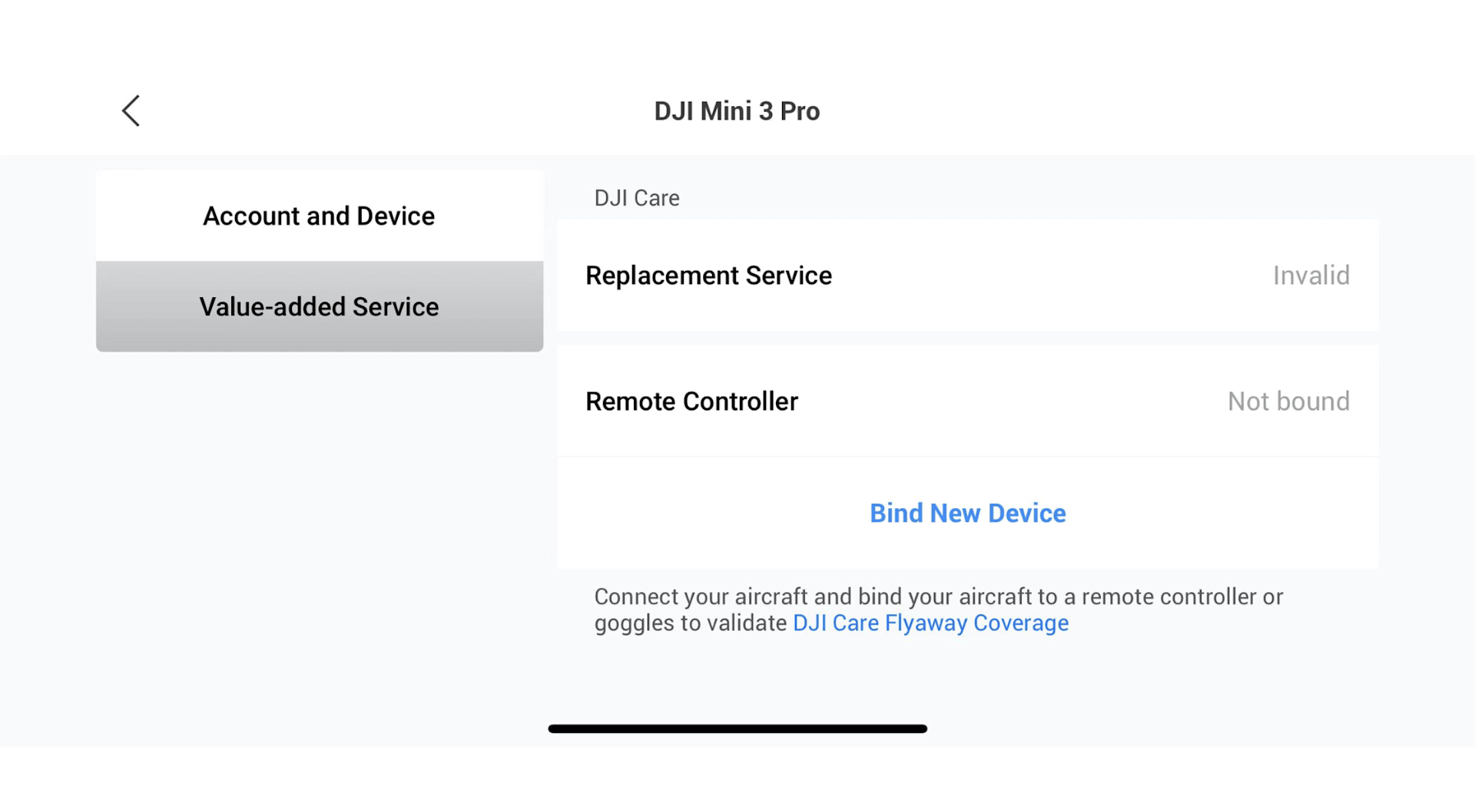 After connecting the drone to a remote controller, select “Value-added Service” in “Device Management” and tap “Bind New Device”.