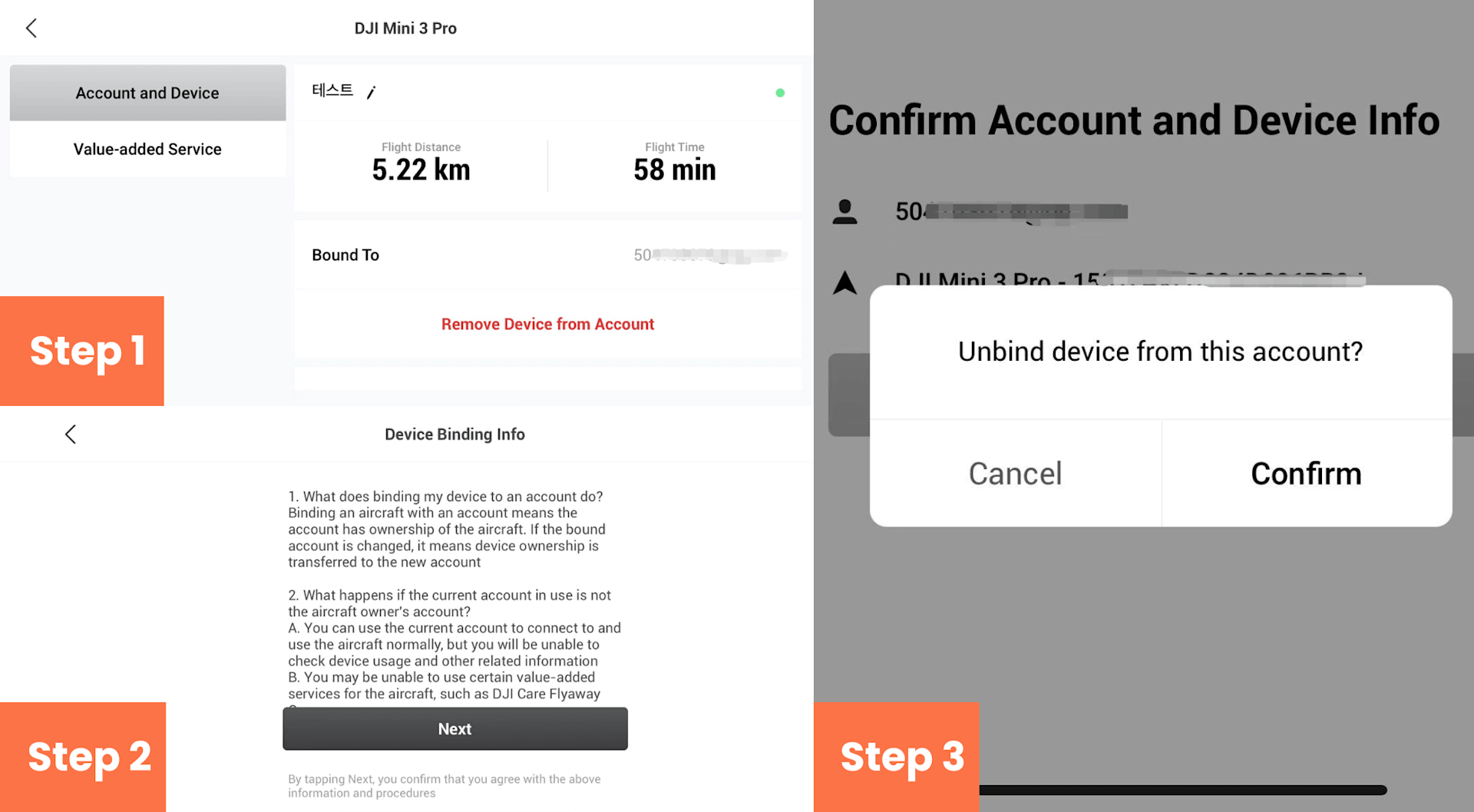 Check the account and drone serial number (SN), and tap “Confirm” to complete unbinding.